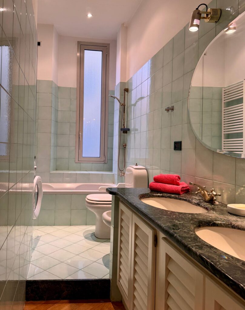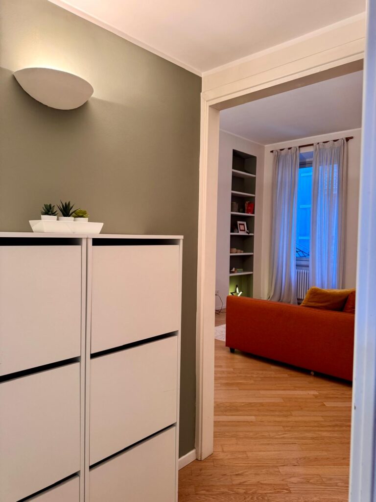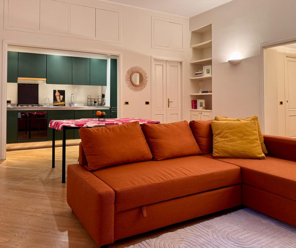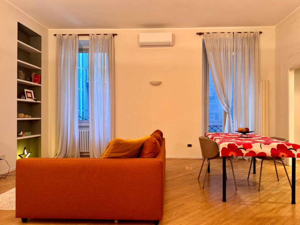 Si tratta di uno spazioso bilocale, eventualmente trasformabile e in trilocale, con doppio soggiorno con portafinestra affacciata sul ballatoio interno riservato, con cucina situata in una nicchia separata. Al disimpegno si affacciano la grande camera matrimoniale con armadio quattro stagioni e il bagno con finestra, vasca, doppio lavandino e lavatrice. C’è parquet in ogni stanza, aria condizionata e riscaldamento autonomo, cantina di proprietà. I soffitti alti consentono di avere una serie di utilissimi ripostigli in quota oltre a uno spazio guardaroba per i cappotti.