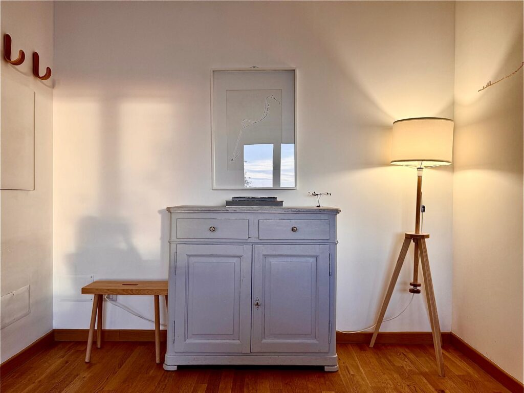 Si entra direttamente nell’ampio soggiorno con cucina a vista, zona conversazione e due grandi porte-finestre da cui si accede al piacevole terrazzo arredato in modo elegante e funzionale per ricevere gli amici.
