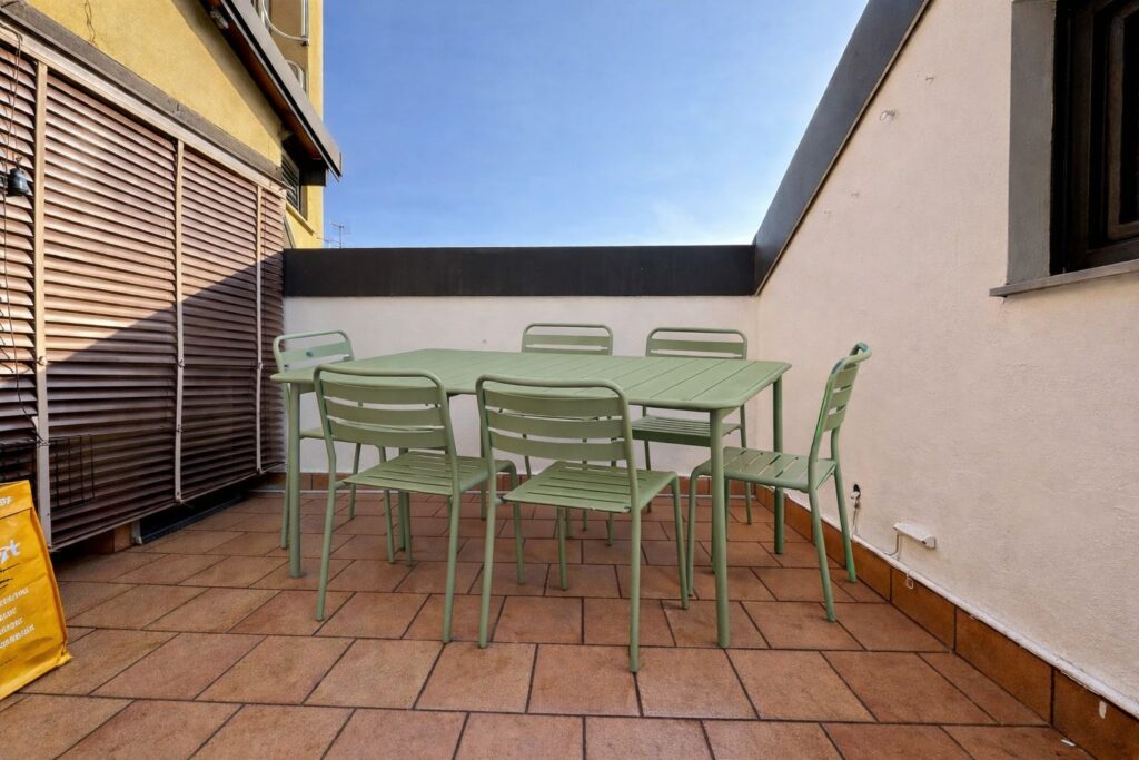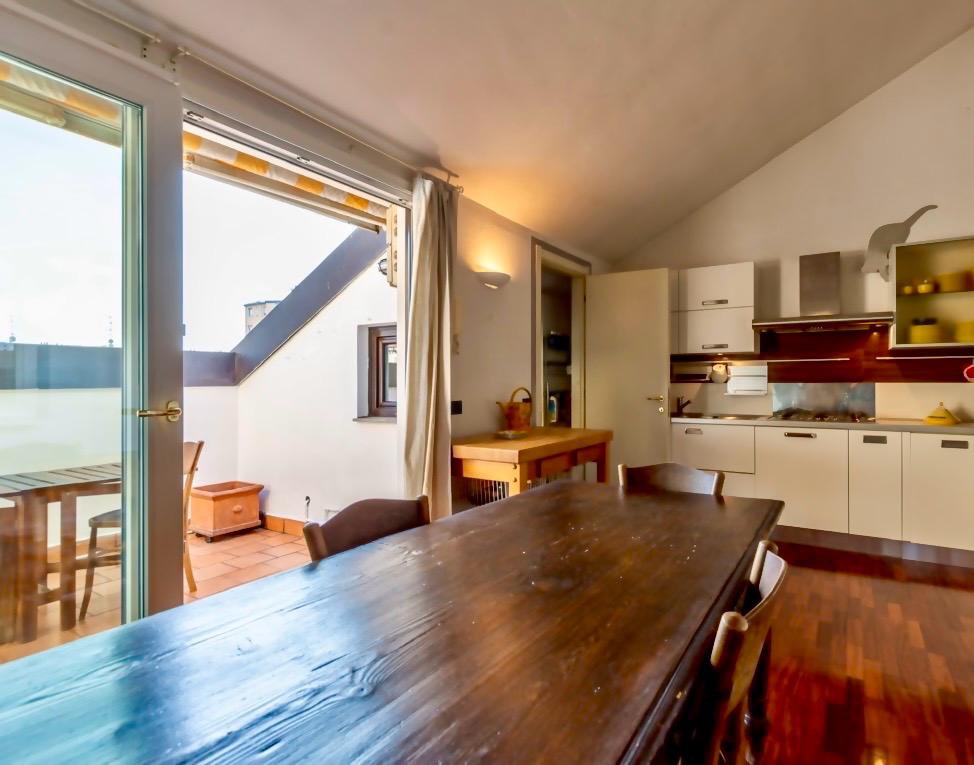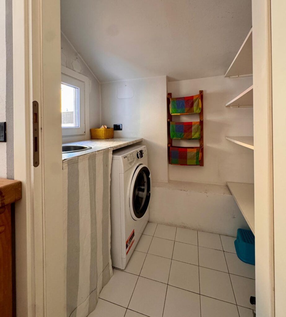 Salendo al quarto piano, affacciata su un soleggiato terrazzo vivibile, abbiamo la grande cucina con lungo tavolo conviviale e, separata, una piccola lavanderia con lavabo e lavatrice.